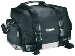 The Canon 200DG Deluxe Gadget Bag (Black with Gray Band) is a Cordura nylon bag designed to carry and protect most Canon SLR camera kits. The bag can hold 1-2 SLR camera bodies with 2-3 lenses, flash and accessories. It has 2 zippered side pockets for flash or accessories and tripod loops on the bottom of the bag. The bag is carried by a carry handle or a removable, adjustable shoulder strap.